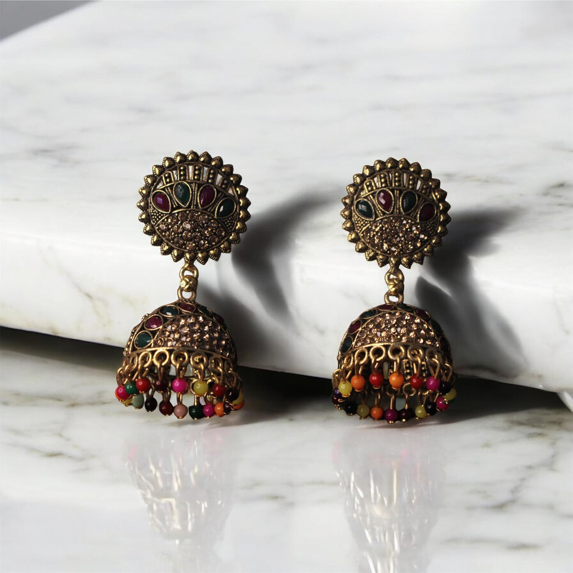 - Bell-shaped jhumkas adorned with multi-colored bead danglers
